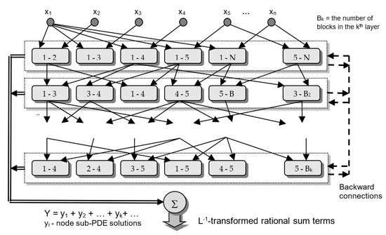 Rational components (8), formed to express the Laplace image terms of uk functions (2), which are not available, result from the GMDH polynomials (7) composed of binary nodes of a PNN tree structure (Figure 3) in the PDE converting procedure. The inverse L operation is necessary (8) in the PNN nodes according to the definition of OC (6). The sum of originals determined by binary nodes in the partial uk is used to calculate the overall model u (2) [8]. Each D-PNN node, using the GMDH output, groups possible simple or composite member solutions (8) for specific two-input sub-PDEs. The selected components are included in the D-PNN output sum to better converge to the target output.