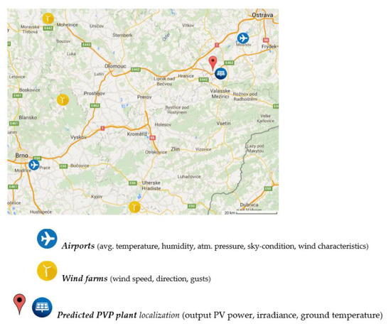 PVP was forecasted at the Starojcka Lhota plant located in the North-East Moravian region of the Czech Republic, using historical measurements of ground environment temperature, PVP, and irradiance along with multisite spatial meteorological data of wind parameters from three nearby regional wind farms located in Maletin, Drahany, and Veseli nad Moravou. These data sets were supplied with free access airport weather observations (avg. ground temperature, avg. humidity, avg. atm. pressure, avg. wind parameters and visibility conditions) of two ground-based stations located in Brno-Turany and Ostrava-Monov (Figure 5). These standard variables were used in the development of models to predict the complete day-ahead PVP cycle data in the 24 h input–output delay. Detailed minute power measurements of the PV plant and wind farms were averaged and extrapolated to correspond to a half-hour meteorological data series from airport weather observation stations [10].