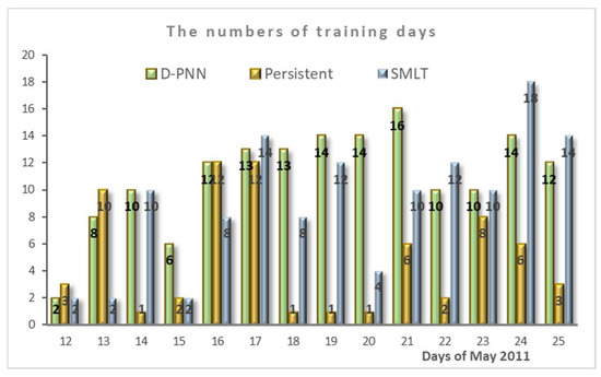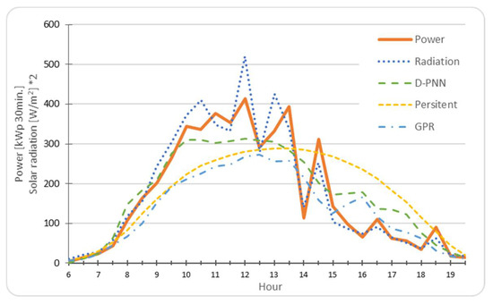 Figure 6 shows PVP forecast results of the D-PNN, Statistics and Machine Learning Tool-Box (SMLT) for Matlab regression [11], and persistent models in the 24 h horizon in specific demonstration days of the examined 2-week interval from 12–25 May 2011. The SMLT day-ahead final forecasting models were chosen considering their test error minima, obtained from the reserved part of available set data. The optimal training days, including applicable data patterns, were predetermined initially by examination of data in the previous gradually increasing training-day intervals, using a simplified model form, the same as using D-PNN (Figure 1). The SMLT forecast models resulting from Gaussian Process Regression (GPR), Support Vector Machine (SVM), and Ensemble Boosted/Bagged Tree (EBT), using the same input–output data sample variables in the next day 24 h CSI sequence prediction, obtained with the testing RMSE minima which differ only in a slight measure. Persistent comparative models, average CSI in processing series over the determined number of the last-day intervals, were used to estimate the approximation series at the responding PVP cycle day time. These oversimplified forecast benchmark solutions could be considered as daily error-reference minima.