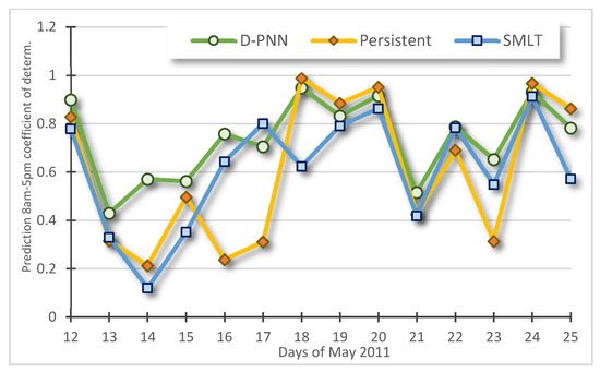 The 2-week daily average PVP prediction coefficient of determination R2: D-PNN = 084, Persistent = 0.787, SMLT = 0.79.