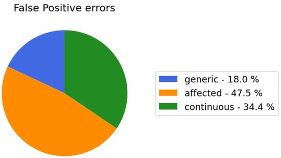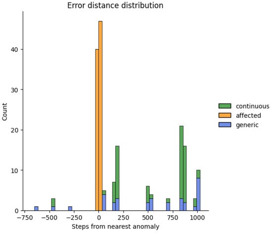 Figure 1 shows the distribution of the FP error categories. For the computation of the “affected” errors, an anomaly window of length 34 was used. Most FPs were within a short distance from the real anomalies (“affected”, in orange), which suggests that the anomaly was perceived before its reported occurrence time and continued to be perceived shortly after. Furthermore, the “continuous” FPs were more numerous than the generic ones, which shows that the model tends to identify prolonged anomalies rather than instantaneous exceptions. Figure 2 shows the distance of each FP from the closest anomaly to confirm that the “affected” FPs were the closest to a GT anomaly. These errors are better appreciated in Figure 3 in which the Visualizer helps show the findings of the analysis more intuitively.