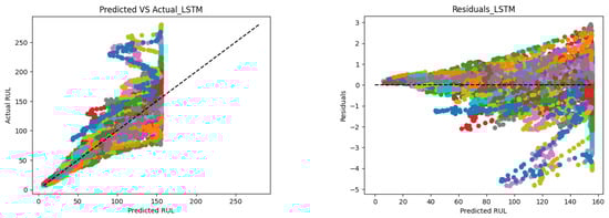The model had an RUL estimation error of 20 cycles (provided by the MAE) and an MAPE of ≈0.17, which denote good performance. Further analysis helps understand where the model can be improved. Figure 4 shows the residual analysis and enables a visual interpretation of the deviation of the predictions from the GT. Two plots report the predicted RUL on the X-axis. The Y-axis of the left plot reports the GT RUL value, while the Y-axis of the right plot reports the standardized difference between the prediction and the GT. Each color represents a different engine. From the analysis, it can be seen that most errors occurred when the component was still in good condition (with an RUL value greater than 100), which highlights the inability of the model to predict the engine’s remaining life in the long term. In particular, the highest predicted RUL was 160, while the corresponding GT value was 260. This suggests that the model is not able to learn high RUL values properly. In scenarios where analysts are more interested in correctly predicting the RUL when the engine is close to a failure, it makes sense to set a maximum GT RUL value to reduce the relevance of large values during training [].