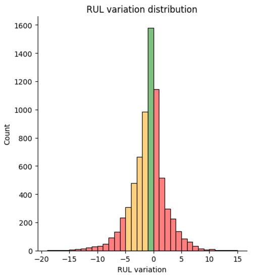 RUL variation distribution: the green bar represents a perfect variation of the RUL estimation, the yellow bars an acceptable variation, and the red bars an inconsistent prediction.