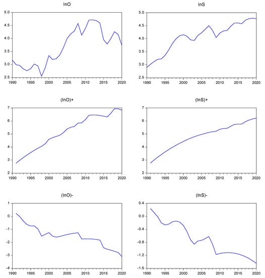 where signifies the initial value of the stock price index in the logarithmic format, which is assumed to be zero, in this case. Note that the equivalency condition is fulfilled. It should be mentioned that the value expressed by Equation (22) represents the good news with regard to the stock market, while the value expressed by Equation (23) signifies the bad news pertaining to the same market. The oil price index can also be transformed into cumulative partial sums of positive and negative components in an analogous way. Note that a drift and a trend were included in the equation of each variable, since it seems to be needed, based on the graphs presented in Figure 3.