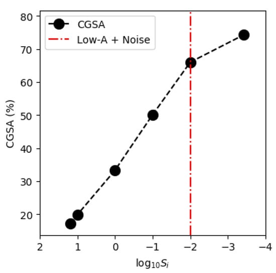 Figure 2. CGSA for the remaining signature after subtracting all peaks with signals higher than l o g S i (black). The red dashed–dotted line points to the remaining signature of low-amplitude peaks and noise after removing intermediate-amplitude variations.