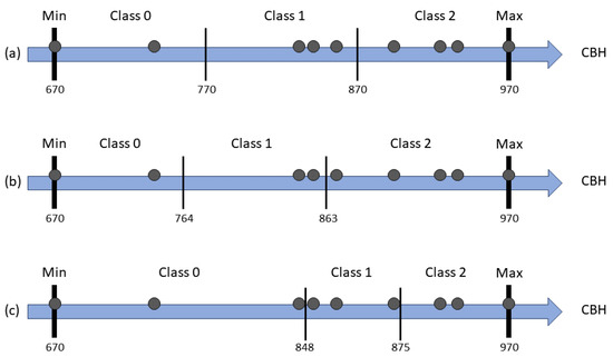 - Equal number of samples: the thresholds dividing CBH classes are set to make three classes with an equal number of samples (848 and 875); this latter partitioning strategy is defined in order to verify the results obtainable with balanced classes in terms of the same number of samples.