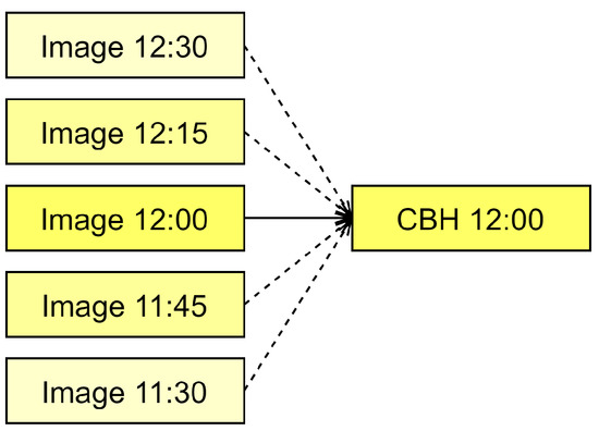 CNNs, in order to be trained, require a large amount of input images. However, in our case study, the available dataset is not that large. In order to address this issue, an oversampling is performed in order to obtain additional generated input samples, useful to improve the training process of the model. Assuming a negligible time variation of the vertical profile of atmosphere, it is possible to assign to a single radio sounding all the images acquired in the surrounding time frames, as graphically represented in Figure 3.