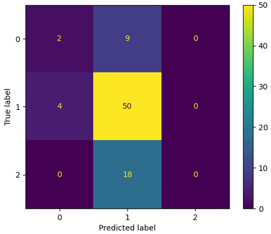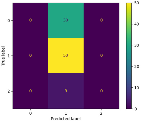 In this case, the developed classification model is unable to recognize the presence of two classes (classes 0 and 2) out of three. As a matter of fact, the only class appearing in the model output is class 1, i.e., the most numerous one. The performance metrics numerically confirm the coherent results represented by the confusion matrix.