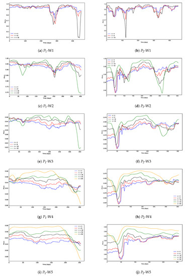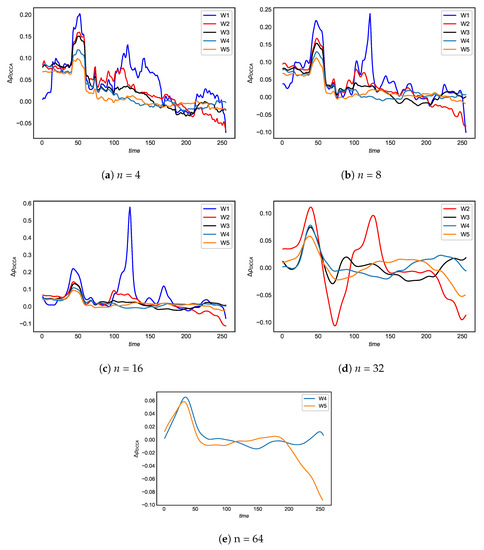 Figure 1 shows the behavior for HO–Brent during periods and for every presented time scale (n) and different sliding window sizes (W1–W5). From Figure 1a,c, one can note that considering a window size of 50 and 100 days, the prices showed a weaker relation during the beginning of 2019, which is not applied to larger sizes of W, and it is an indication of short-term effects. Moreover, we can notice that all the window sizes (W1–W5) exhibited a fall in cross-correlation in the period that preceded the COVID-19 outbreak.
