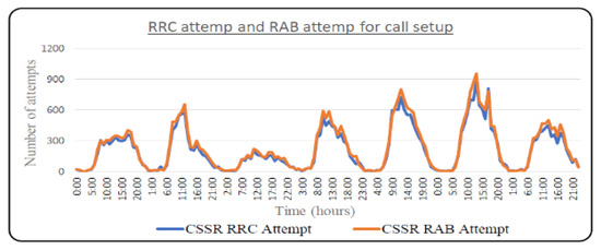 - If no voice or data service attempts are made in a cell for one hour, the accessibility and retainability values are zero. This situation is handled separately, and the accessibility or retainability status is “Idle.” Figure 1 shows RRC and RAB attempt values for Cluster 6 throughout a week, and both values are zero at midnight.