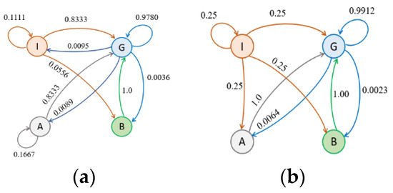 Note that there are missing arrows in the two figures. As an example, there is no arrow in Figure 2a pointing from state A to state I, indicating that such a transition does not exist or the system has never landed in an idle state if it was initially in the Acceptable state.