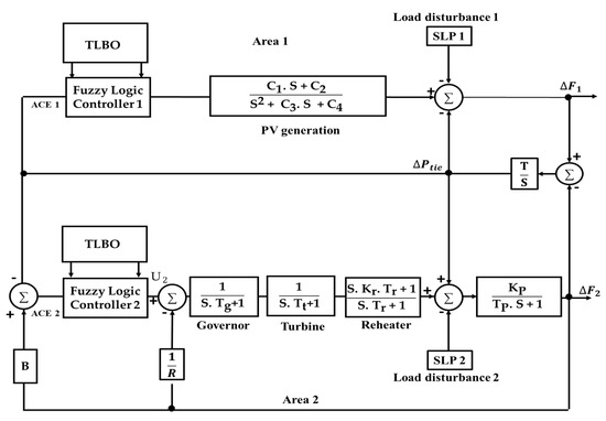 As shown in Figure 1, this system consists of a PV plant equipped in area one and a thermal unit installed in area two. This system has extensively been used in the literature [3,7]. The values of the parameters of the investigated system are as follows