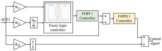 Figure 2 demonstrates the structural diagram of the proposed controller. This controller comprises two parts; a fuzzy cascade FOPI-FOPID enhanced with a classical I controller. As is obvious, the fuzzy part has two inputs: “the Area Control Error (ACE) and change of ACE” in addition to one output. The output signal of the fuzzy controller is connected with the input of the FOPI. However, the input signal of the latter controller “FOPD” is the output signal of the FOPI in addition to the ACE signal. Finally, the output signal of FOPD is added to the output of the classical I, which in total represent the control signal of the proposed controller. The rule bases of the fuzzy controller are given in Table 1, while the membership function of the inputs and the output are illustrated in Figure 3.