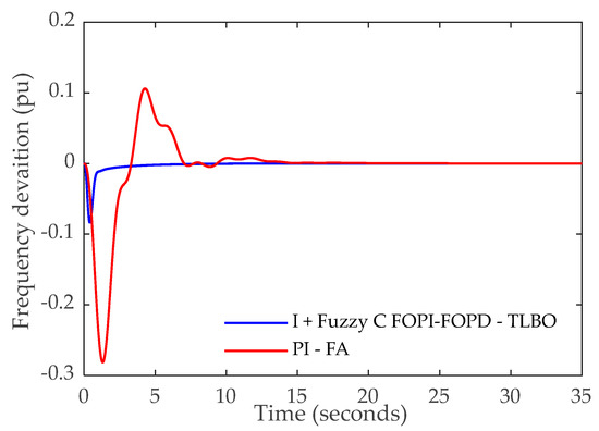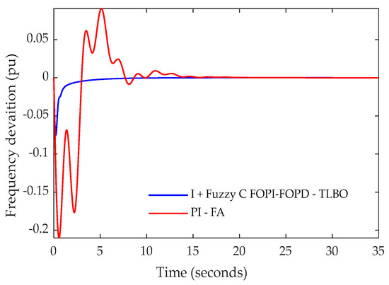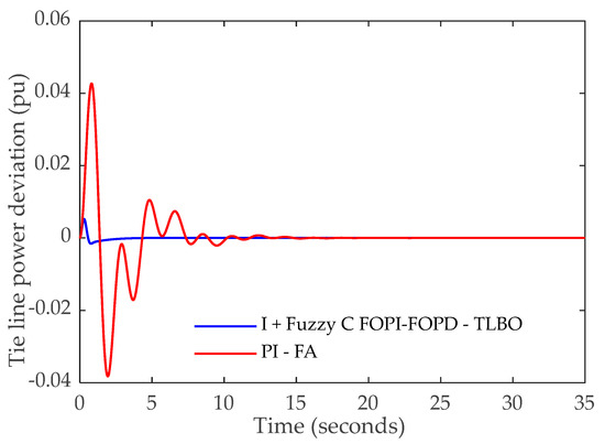 The proposed controller is equipped in the system, with a controller in each area; then a load disturbance of 0.1 pu is applied in area two. The optimal values of the controller obtained by TLBO are given in Table 2. The frequency deviation in areas one and two and the tie-line power fluctuation are given in Figure 4, Figure 5 and Figure 6, respectively, in addition to Table 3. Additionally, these figures provide a comparison between the results obtained via the proposed fuzzy controller and the results from the PI tuned by FA. Figure 4, Figure 5 and Figure 6 and Table 3 reveal the effectiveness and superiority of the proposed fuzzy controller. This controller successfully met the requirements of LFC systems and provided excellent responses in all aspects.
