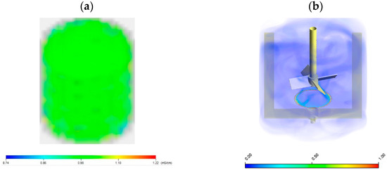 Gas dispersion upon scale-up: (a) 3D tomogram obtained from ERT, and (b) gas volume fraction obtained from CFD (central impeller speed = 192 rpm, anchor impeller speed = 10 rpm, and aeration rate of 0.12 vvm, 0.5 wt% CMC).