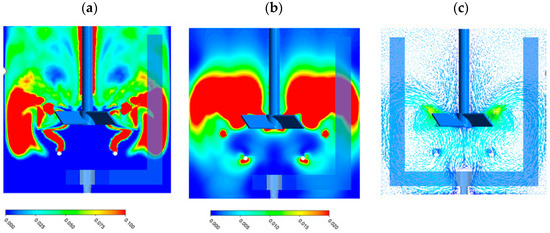 kLa and the aeration rate (volumetric flow rate of air per volume of working fluid) were kept constant at both small and large scales to investigate the performance of the PBU-anchor mixer upon scale-up. The specific power consumption of the large-scale mixing tank was found to be lower than that of the small-scale mixing tank when this method was used as a scale-up approach to maintain the mass transfer coefficient constant. As can be seen in Figure 2, it was observed that reasonable gas hold-up and energy dissipation rate distributions were achieved for the large-scale mixer. As shown in Figure 2c, the fluid velocity vector profile demonstrated that the flow regime acquired by the large-scale PBU-anchor mixer in the co-rotating mode was under complete dispersion condition upon scale-up.