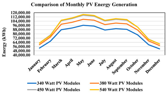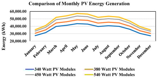 By comparison, we analyze that the photovoltaic energy generation system installed with 450.0-watt PV modules are more efficient (having a high PR ratio and kWh/kWp) installed in a fixed area of the University of Agriculture Faisalabad. For this case, the simulation results show that the annual energy generation of the photovoltaic system is 1.125 GWh, and the performance ratio (PR) of the system is 78.3%. The comparison of monthly photovoltaic energy generation for different PV module ratings installed in the University of Agriculture Faisalabad is shown in Figure 2.