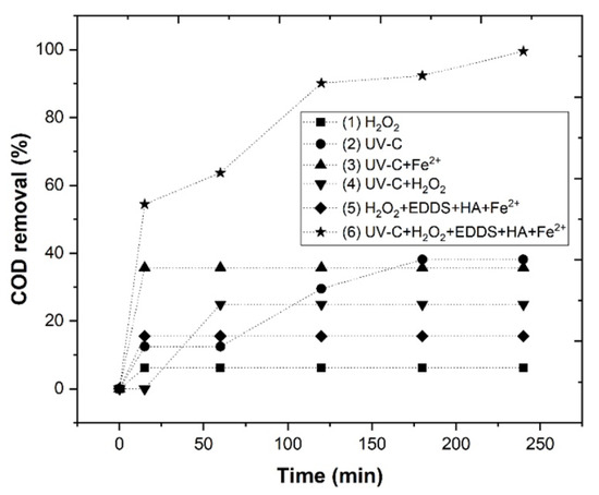 To evaluate the efficiency of the photo-Fenton system, the following experiments were carried out: (1) H2O2, (2) UV-C, (3) UV-C+Fe2+, (4) UV-C+H2O2, (5) H2O2+EDDS+HA+Fe2+, (6) UV-C+H2O2+EDDS+HA+Fe2+, reaching a COD removal of 6.2, 38.1, 35.7, 24.9, 15.5 and 99.5%, respectively (Figure 1). The high efficiency of the Fe2+-EDDS-photo-Fenton process can be attributed to the formation of more hydroxyl radicals () than the other processes. This means that the UV-C lamp shows a sensitive increase in COD removal in comparison to the EDDS-Fenton system.