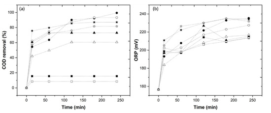 All the COD removal experiments were performed in triplicate and the observed standard deviation was always less than 5% of the reported values. The statistical analysis was performed by OriginLab 2019 software (Northampton, MA, USA).