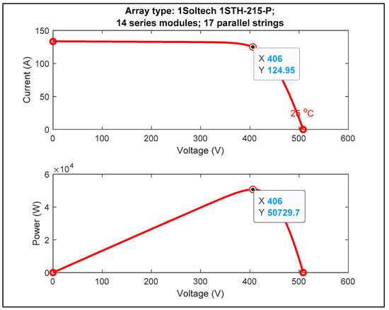 The Solar Panel Connected Parallel will generate the amount of Current and connections in Series will be determining the Voltage of the solar farm [1]. One string connected in Parallel will generate a Current of 7.35 Amps; similarly, the Series-connected string will generate about 29 V In this model, 17 strings are connected in Parallel, which generates 124.95 Amps, and 14 strings in Series, which contain about 406 V of Voltage. The total Power rating of this PV system is 50 kW, as illustrated in Figure 1, which shows the Configuration of the Solar PV System. The MPPT and MPC for the Solar PV System are explained in Section 2.1.
