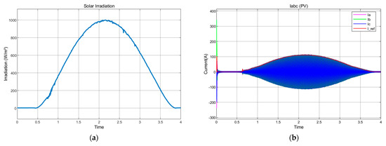 (a) Solar Irradiation in Watts per unit area (W/m2); (b) PV Current (Iabc and Ref Current).