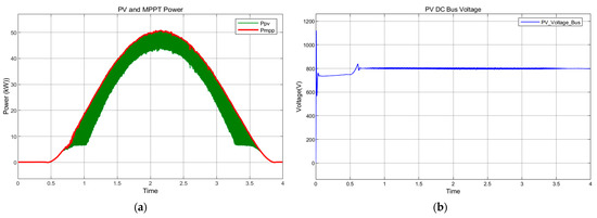 (a) Solar PV and Maximum Power Point Tracking Power comparison; (b) Solar PV DC bus voltage.