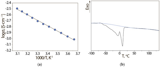 The polymer electrolyte was 154% swollen film with a thickness of ~160 μm. The degree of solvation of the obtained membrane was 19.4 solvent molecules per sulfonic group. The temperature dependency of the ionic conductivity of the studied sample obeyed the Arrhenius equation and was linearized in logs−1000/T plot (Figure 1a). At room temperature, the ionic conductivity was 1.8 mSm·cm−1, which exceeded the values typical for most polymer electrolytes and met the requirements for electrolytes in lithium metal batteries [8]. The value of the activation energy of conductivity calculated from the slope of the straight line was 17.5 ± 0.3 kJ·mol−1. The DSC curve of the solvated membrane showed two endothermic peaks beginning at −57 °C and −5 °C (Figure 1b), which corresponded to the glass transition and complete melting temperatures of the solvent mixture.