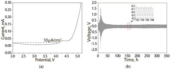 (a) Voltammetry of a SS/Li cell and (b) galvanostatic cycling of a symmetrical Li/Li cell at a current density of 0.1 mA·cm−2 for 350 h and selective cycles for about 150 h.