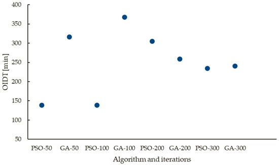 Initially, the goal was to reduce only makespan, which was found to be the same, 1259 min for different iteration sizes of PSO and GA. When compared to the actual production line efficiency, these schedules reduce the makespan by 8.7%. However, the OIDT for these optimized schedules displayed no pattern and appeared to be dispersed unevenly between 139 min and 368 min. It raises the possibility of significant waste in terms of cost and CO2 emissions that may be avoided from an operational perspective. Figure 2 shows the OIDT distribution is derived by PSO and GA with various iteration sizes. This suggests that having the shortest makespan does not guarantee the shortest OIDT.
