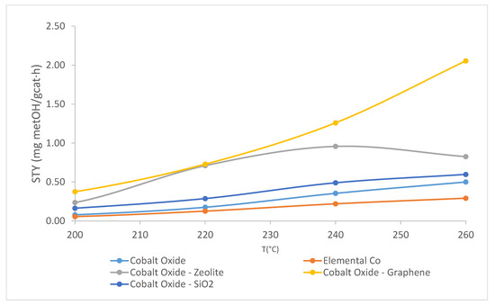 The catalytic activity of the different cobalt compounds was investigated for the catalytic conversion of CO2 to methanol. Catalytic tests were performed at a mild operating pressure (10 bar) and a flow rate of 10 mL/min, with temperature varying between 180 and 260 °C. Five different cobalt compounds were tested: elemental cobalt, cobalt oxide (Co3O4), cobalt oxide supported on zeolite (Co3O4—zeolite), cobalt oxide supported on graphene (Co3O4—graphene), and cobalt oxide supported on silicon dioxide (Co3O4—SiO2). Their catalytic results were expressed in terms of space–time yield (STY), which expresses the methanol production per gram of catalyst and hour of experiment, with results shown in Figure 1. As expected, the results of elemental cobalt show the lowest amount of methanol that was obtained, as single metals are normally less active than oxides or bimetallic systems [8].