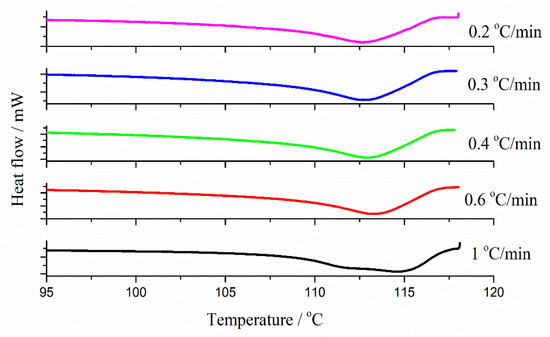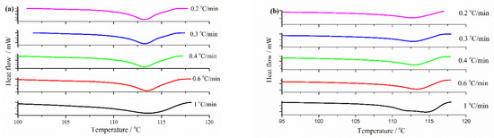 μDSC melting curves of (a) LDPE and (b) LDPE with 1% rosemary at several heating rates, in nitrogen atmosphere.