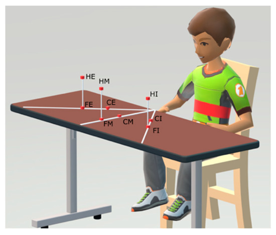 Nine targets were positioned along three directions: (i) middle, on a parasagittal line emanating from the subject’s shoulder, (ii) internal, and (iii) external, with an incline of ±45° with respect to the parasagittal line. Targets were composed of a red tape of 10 mm with a vertical stick of 15 mm of diameter. Figure 1 depicts the experimental setup. Distances between targets and subject were parametrized with respect to the anatomical upper limb length, i.e., the distance between the acromion and the end of the pointer. Two distances were considered: (a) far, corresponding to 90% of the total upper limb length, and (b) close, equal to 65% of the upper limb length. Six targets were placed at 70 mm of height from the table level, and three were placed above the distal sensor, at the same quote of the acromion from the table surface.