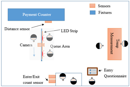 The setup assumes the floor space of small retail businesses and checks for the number of people entering or leaving the space, any COVID-19 symptoms before entering, their body temperature, the distance between the queued customers, and distance between the customer and the office counter, Figure 1. Infrared obstacle detectors keep a count of incoming and exiting individuals at the entrance and exit points, providing a required measure of the number of people per square meter. Upon entering the premises, the individual is required to answer the COVID-19 symptom-related questionnaire which is linked to the dashboard. They then move on for the body temperature measurement using a non-contact IR temperature sensor MLX90614. When queuing at the customer service or payment counter, addressable LEDs WS2812B are used to visually display the permissible queuing locations. The locations available in a queue correlate to the number of individuals entering the business space. For instance, if only two persons enter, the queue will allocate the two furthest apart locations possible in the queue area. As more people enter, the number of available queuing locations updates whilst maintaining a minimum of 1.5 m distance between locations. A time of flight (ToF) sensor VL531x at the counter is used to measure the distance of the front-most individual in the queue and provides alerts to the individual (and the system) if minimum distance is violated.
