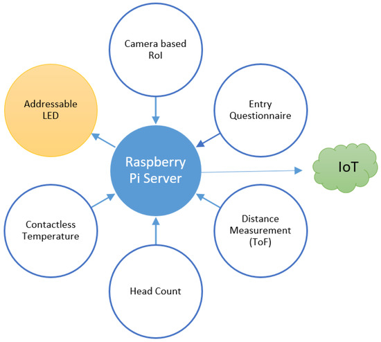 Figure 2 presents the system sensor connectivity. This setup can work in place of, or in conjunction with, any physical markers or stickers currently prevalent in the industry to ensure COVID-19 safety. Raspberry Pi 4 was set up as a server to communicate with the sensors and log data. The parameters recorded were people in, people out, current people, total people count/day, violations in the queue, and the individual temperature reading was communicated through sockets. The information collected was then uploaded on ThingSpeak [10] daily. This information is then retrieved for auditing, monitoring, and planning purposes. The dashboard was designed to be compatible with mobile, tablet, desktop computers.