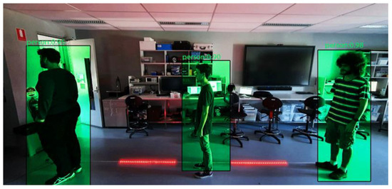 A 5 m long addressable (ws2812b) LED strip was used to mark the queue area (Figure 3c). Green LEDs mark the “safe” standing location. The RPi camera was set up near the queue to detect any minimum distance violation. MobileNet-SSD (single shot detector) with the Caffe model was used for detection, classification, and bounding box localization of individuals in OpenCV. Figure 4 illustrates a screen capture of MobileNet-SSD detecting persons in the camera stream. Queue space with red LEDs was set as a region of interest (ROI) and each ROI was assessed for the presence of a person. Red LEDs of the addressable strip were used to visually warn the individual about safe distance violation by blinking, and violation was also highlighted on the dashboard.