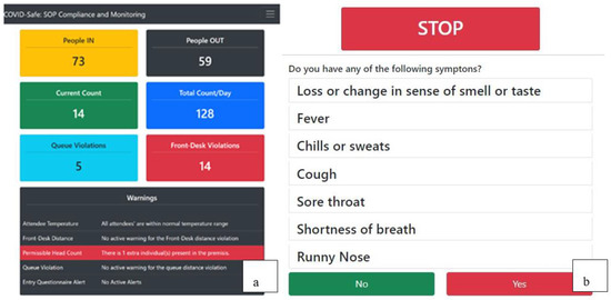Figure 5a shows the dashboard which graphically displays relevant data received from sensors through the RPi server which was collected over single a day. Sensor data were also displayed on a smartphone. The dashboard was divided into two sections. The first section showed the numerical data regarding the footfall count and the total number of violations. The second section displays the list of any warnings active at any given time. Figure 5b shows the questionnaire presented to individuals upon entering the premises. If the answer to the questions was “Yes”, an alert is generated on the dashboard indicating the need for assistance by a staff member at the entrance.