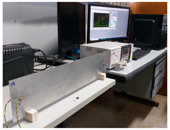 To verify the piezoelectric transducer’s sensitivity to damage detection at high frequencies, two aluminum plates were used as structures to be monitored, one with dimensions of 500 mm × 119 mm × 1 mm (Structure A) and the other with dimensions of 304 mm × 196 mm × 1 mm (Structure B), supported by rubber blocks. In this study, low-cost piezoelectric diaphragms, which are sound components mass-produced by several manufacturers, were evaluated. Three types of piezoelectric diaphragms were used as transducers, all from Murata Manufacturing, as follows: a 7BB-15-6, with an active piezoelectric element with a diameter of 10 mm; a 7BB-20-6, with an active piezoelectric element with a diameter of 14 mm; and a 7BB-35-3, with an active piezoelectric element with a diameter of 25 mm. One transducer of each type was attached to each structure using cyanoacrylate adhesive, so that all diaphragms were at the center of the plate and 50 mm from one of the plate’s ends. Structural damage was simulated by means of attaching two steel nuts to the structures, one with dimensions of 9 mm × 4 mm (Large Damage) and the other with dimensions of 4 mm × 1.5 mm (Small Damage). The nuts were used one at a time, coupled to the structure at its center point. The experimental setup is shown in Figure 1.