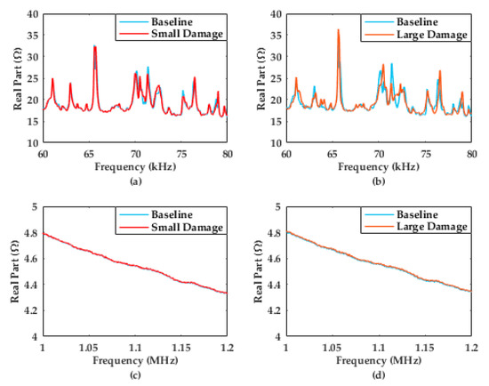 As mentioned previously, structural damage changes the transducer’s electric impedance, causing the electrical impedance signature to change in relation to the baseline. This can be seen in Figure 2, which shows the real part of the impedance signatures obtained for the largest transducer on Structure B, for both low and high frequencies and for small and large damages.
