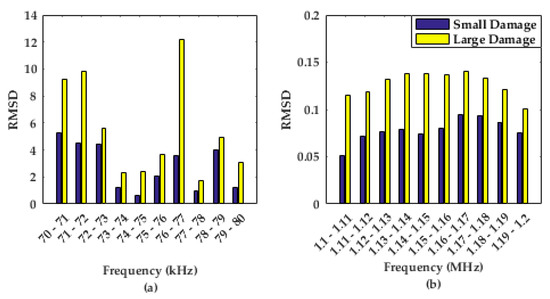 The RMSD and CCDM indices are presented in the range from 70 kHz to 80 kHz for low frequency and in the range from 1.1 MHz to 1.2 MHz in order to facilitate the visualization and comparison of the results.
