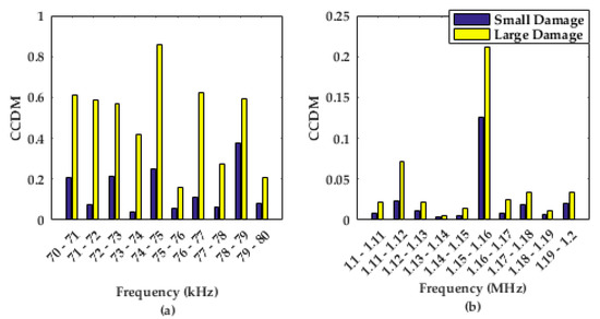 CCDM indices obtained from the largest transducer on structure B for small and large damages for (a) low frequency and (b) high frequency.
