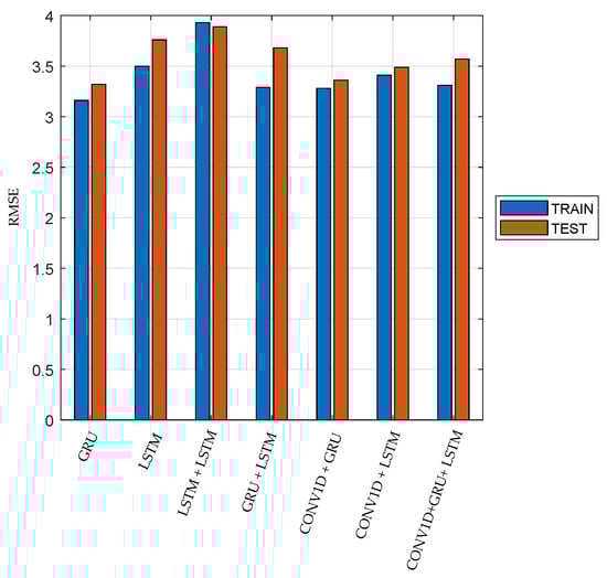 RMSE results in the 16 thermocouples for the train and test sets versus the different deep learning models.