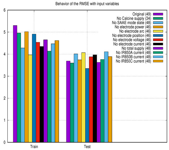In order to determine the behavior of the models in relation to the different input variables, different tests were carried out using the GRU model and limiting the number of input variables. The results obtained are shown in Figure 2. Figure 2 shows that, in the training process, the mean square error values decrease to a greater extent when the arc variables are eliminated in the electrode. Additionally, the best behavior in the test set occurs if we eliminate the variables corresponding to the electrode position.