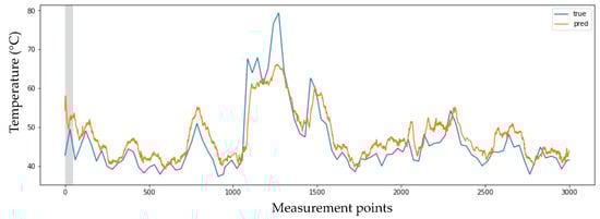 As results of the GRU model evaluation, a comparison of the predicted and true behaviors for one thermocuple in the test set is shown in Figure 3. An RMSE of 4.06 Celsius degrees was obtained in the 3000 measurements for the GRU model.