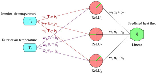 The ANN in this paper consists of two inputs (neurons) in the input layer, one hidden layer with three perceptrons (neurons), and an output layer with one output. This type of the ANN MLP (with one hidden layer) is usually called plain vanilla. The inputs are internal and external air temperatures used for “feeding” the ANN, and the output is the predicted heat flux used for back-propagation process. This ANN model is trained on three sets of data points derived from [3]. The first case is done on 1/4 of the total data points, the second on 1/2 of the total data points and the third on the 2/3 of the total data points. The cost function is created using the mean squared error (MSE) and it is minimized using the stochastic gradient descent method with Adam [8] optimizer. The schematic architecture of the ANN model is shown in Figure 3. The activation functions for all the neurons in the hidden layer is a ReLU function, and the activation function for the output layer is a linear function. For the prediction comparison two more parameters, alongside with the MSE, were used – the Root Mean Squared Error (RMSE) and the Mean Absolute Error (MAE).