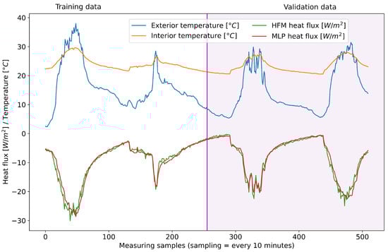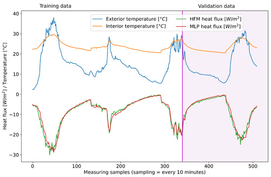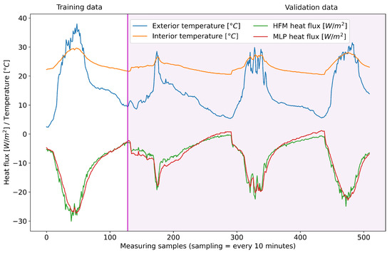 This paper has shown promising results for the application of the MLP method on the heat flux rates measurement results in order to decrease the time needed to carry out the measurement when one heat flux sensor must be used. If the method shown in this paper is used on the collected dataset, then the procedure allows for the movement of the heat flux sensor to another measurement location, but only after satisfactory heat flux prediction is achieved. Because of that, two measurements can be carried out simultaneously. This research has focused only on one dataset; the analysis was done on a different number of training data points to show the feasibility of the MLP method. To analyze the method’s accuracy, potential risks, and advantages, more field and laboratory tests should be carried out. Furthermore, the definition of satisfactory level of prediction precision should be carried out in future research.