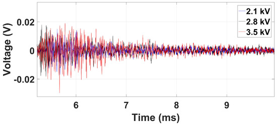 An oscilloscope was set to a 100 MHz sampling rate. All cables were grounded, and the signals were amplified 25 times by INA128P in order to avoid electromagnetic interference. This integrated circuit was used as an antialiasing filter once its frequency response is until to 400 kHz. Because the degradation level of the dielectrics and the electric field can interfere in the PD activity evolution, a voltage of 2.1 kV, 2.9 kV, and 3.5 kV was applied in the copper electrode. For each acquired signal, the energy of the approximation and details coefficients of Daubechies wavelet was calculated.