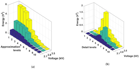 All of the approximation levels were effective in assessing the PD evolution since the energy of the coefficients increase with the voltage applied. The approximation levels 1, 2, and 3 have higher values of energy since it grows around from 1 V to 2.5 V and 5.5 V for each increment of 700 V in the electrode. Wavelet levels 7, 8, 9, and 10 were less sensitive, once the values of the energy were less than 1 V. By Figure 3b, only the detail levels 5, 7, and 8 perform the PD evolution characterization. Level 5 has higher sensibility, since the energy increased from 0.4 V to 0.6 V and 1.94 V