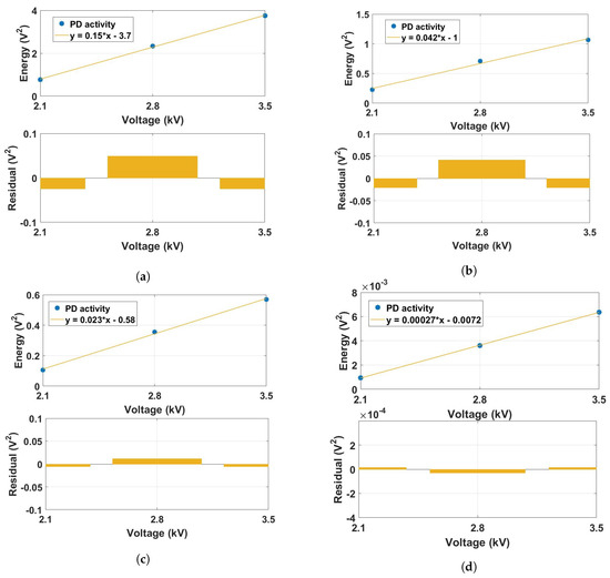 The linear fit of the energy points per voltage applied was calculated intending to quantify the quality of the wavelet analysis to assess PD evolution. Besides, the residuals, i.e., the difference from the points to linear fit were taken for the four wavelet levels that presented lower residuals.