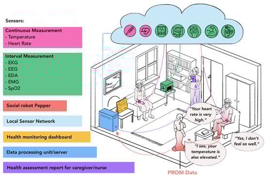 There are various approaches in the research field of assistive technologies in the care sector. In [4], Majumder et al. provide a survey on wearable sensors used for health monitoring, which includes electrocardiograms (EKGs), electrodermal activity (EDA) sensors, blood oxygen saturation (SpO2) sensors, and activity monitoring devices. In [5,6,7], further remote health monitoring systems are presented. In their review, Marques et al. [8] detail internet of things (IoT)-related technologies used in health care, which are essential for connecting sensors to health monitoring systems. The ENRICHME project [9] uses an assistive robot to support elderly people at home. Loza-Matovelle et al. [10] introduce an architecture of robots and sensors for elderly in an ambient assisted living environment. Do et al. [11] combine smart home sensors with robots for activity monitoring, fall detection, and rescue by the robot. Robots and sensors are also used to assist elderly people with dementia [12] and depression [13]. In [14], a social robot is used to complete patient-reported outcome measures (PROMs), used to determine a patient’s health and well-being, in conversation with the patients. The participants in this study had a positive impression of the interaction with the robot.