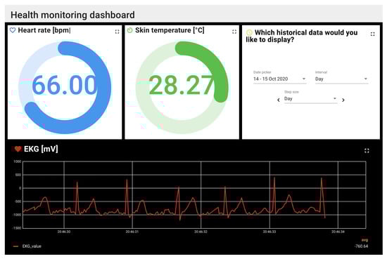 An example of the health monitoring dashboard, generated using ThingsBoard, is shown in Figure 2. It can be accessed through any browser in the same network, using the IP address and specified port of the host. The heart rate (top left) was measured using an optical measurement on the wrist. The skin temperature (top middle) was also measured by skin contact on the wrist. While this type of sensor and application can not be used to measure the core body temperature, it is nevertheless useful in determining fluctuations in skin temperature and deviations from the normal temperature values of the user, once a baseline has been established. The EKG (bottom) is shown in real time and can also be used to measure the heart rate or the heart rate variability to determine the heart health of the user. Additionally, the obtained EKG can be sent to the nurse or doctor of the user. It is also possible to visualize historical data using the dashboard, the desired interval can be specified using the top right widget. To visualize the data of other sensors, additional widgets can be created and customized based on user preferences.